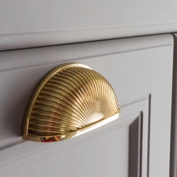 黃銅貝殼造型拉手 材質:黃銅金屬 尺寸: 孔距6.4CM 長8CM*寬4CM **下單務必備註板厚,以避免螺絲庫存不足,導致補發需較長時間。 如無告知,螺絲一律按常規2.5CM 適用板厚1.8CM配置。