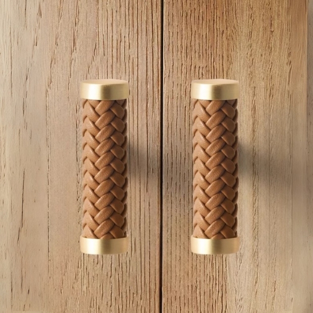 編織皮格拉手 材質:皮革+黃銅金屬 尺寸: 長5.4CM*高3.6CM **下單務必備註板厚,以避免螺絲庫存不足,導致補發需較長時間。 如無告知,螺絲一律按常規2.5CM(長度) 適用板厚1.8CM配置。