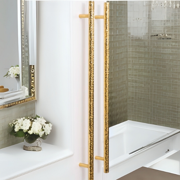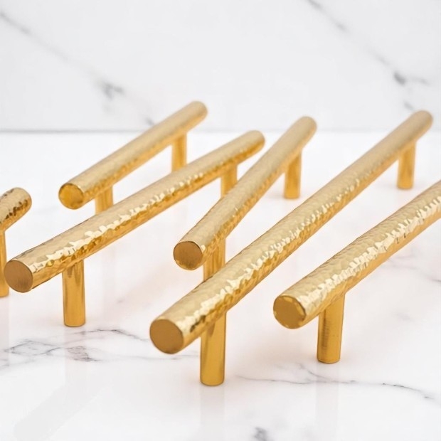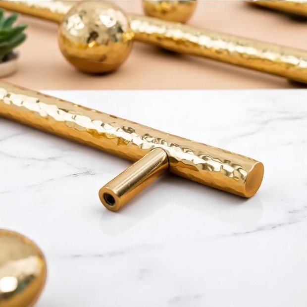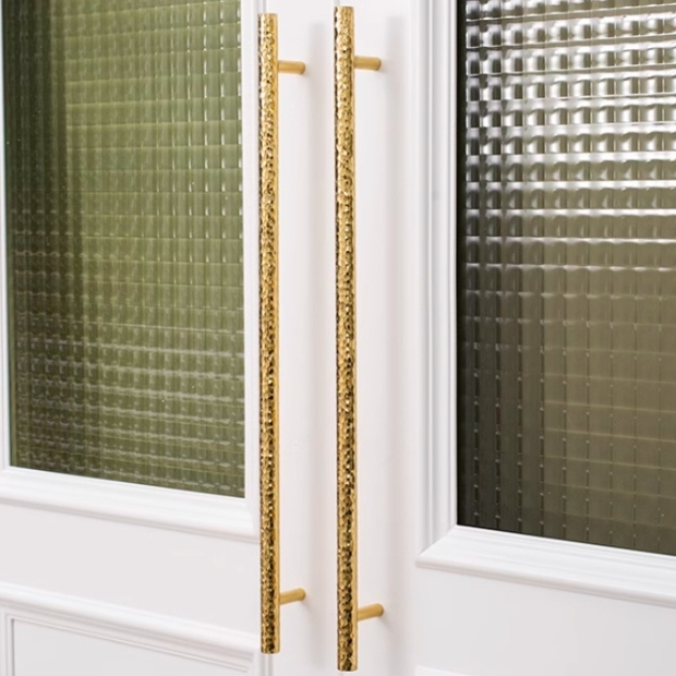 黃銅錘紋大把手 材質:黃銅 顏色:金色 尺寸: 孔距32CM 長38CM*高3.5CM **下單務必備註板厚,以避免螺絲庫存不足,導致補發需較長時間。 如無告知,螺絲一律按常規2.5CM 適用板厚1.8CM配置。
