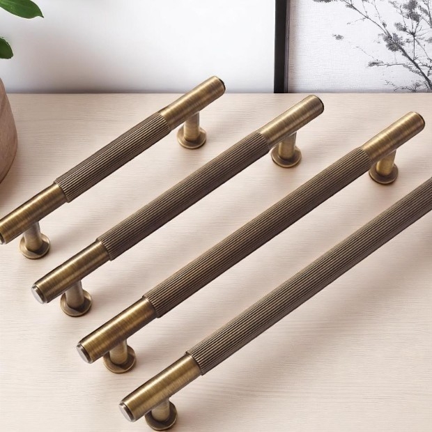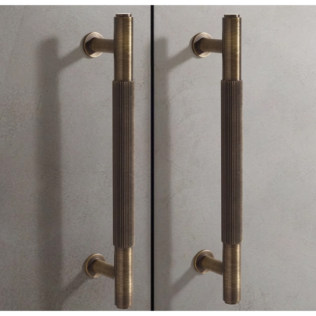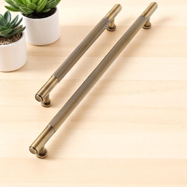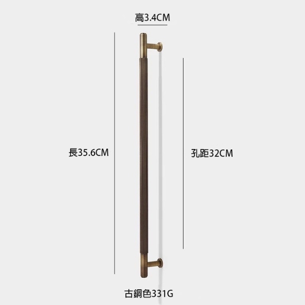 黃銅復古風仿古銅大把手 材質:黃銅 顏色:仿古銅 尺寸: 孔距32CM 長35.6CM*寬1.4CM*高3.4CM **下單務必備註板厚,以避免螺絲庫存不足,導致補發需較長時間。 如無告知,螺絲一律按常規2.5CM 適用板厚1.8CM配置。
