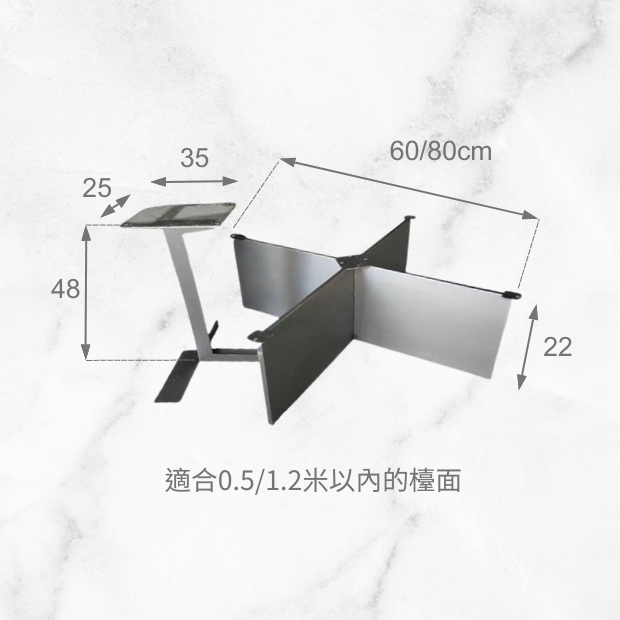 交織 組合方桌(不含桌面) 方桌桌腳尺寸規格: 60cm*22cm / 80cm*22cm **適合1.2米以內檯面 立桌桌腳尺寸:35cm*25cm*48cm **適合0.5米以內檯面 材質:不鏽鋼/電鍍拉絲紋理 顏色:灰鈦啞光
