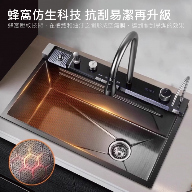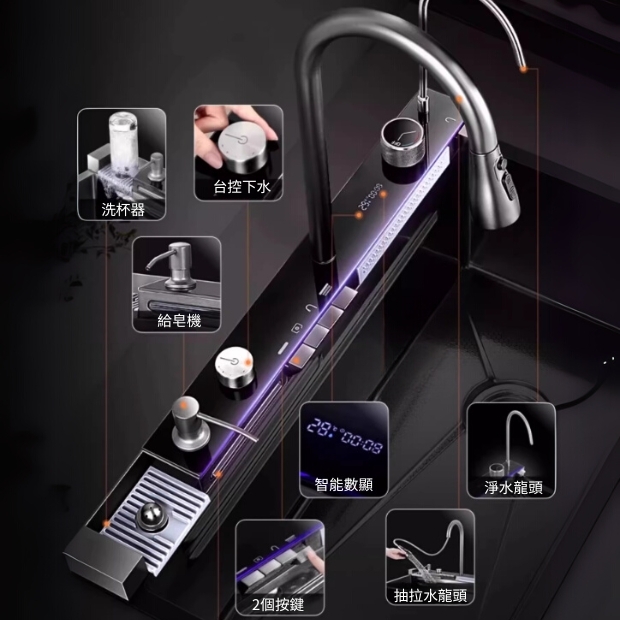 - 標配: 水槽、LED數位顯示水龍頭、2個按鍵-可控制飛雨瀑布出水、水龍頭出水、給皂機、盆中盆、瀝水籃